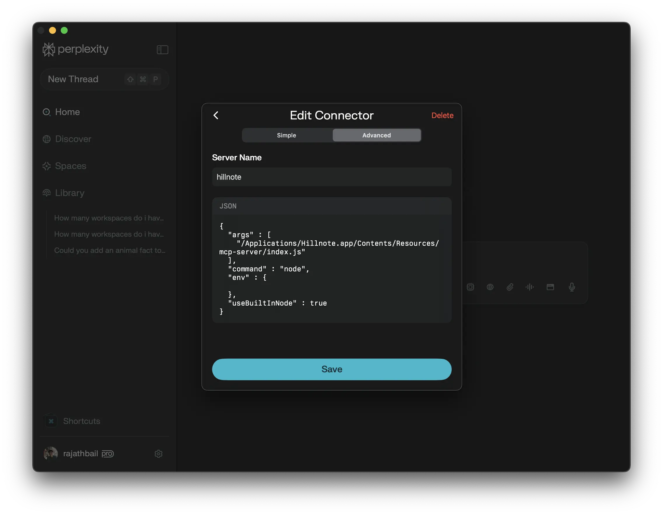 Linking Hillnote with the Perplexity app is fairly simple and fairly well explained here: https://www.perplexity.ai/help-center/en/articles/11502712-local-and-remote-mcps-for-perplexity