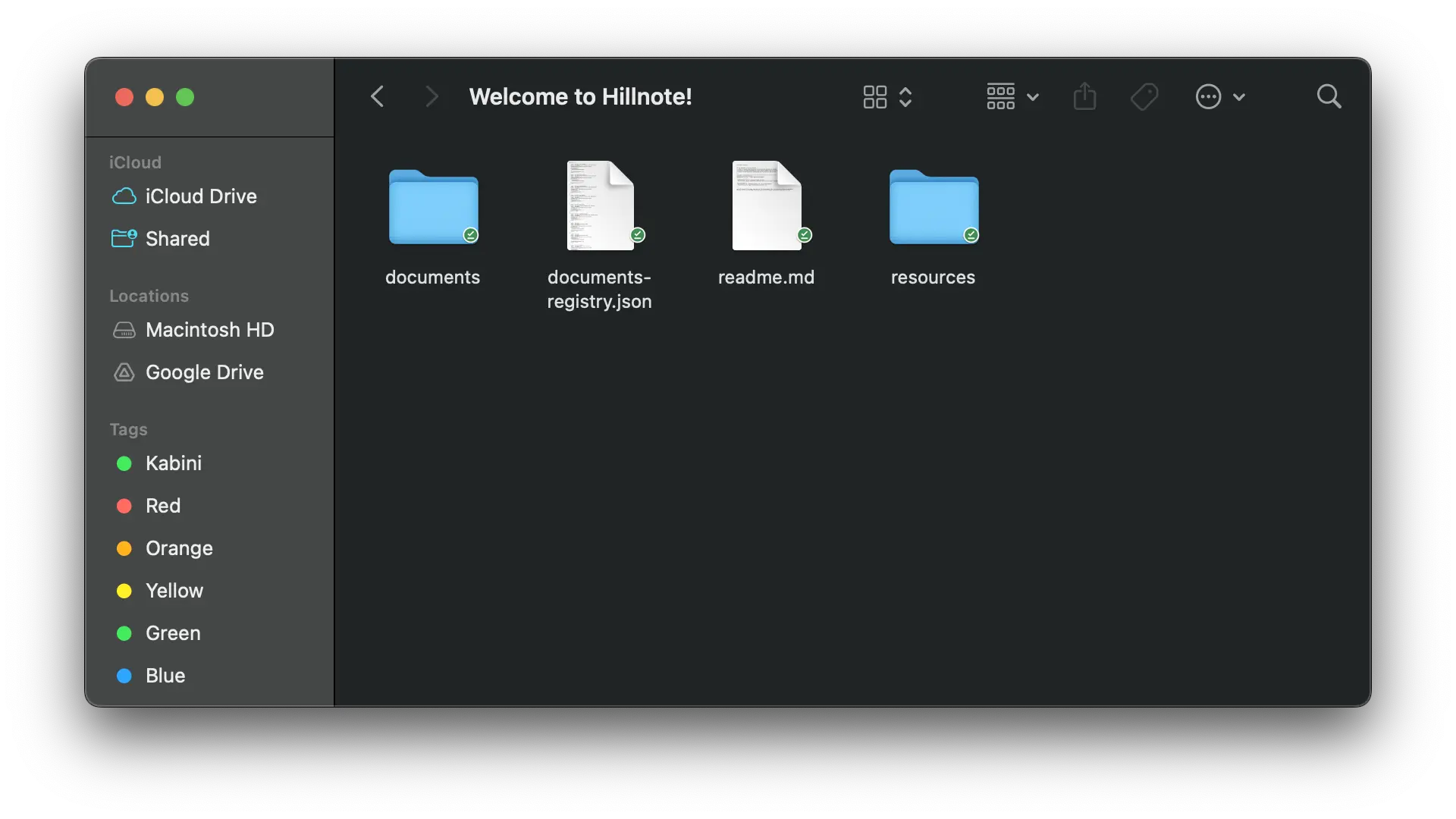 Within Hillnote, everything is organised inside of a workspace document β you decide exactly where itβs stored. These workspaces contain both documents, formatted in easy-to-use Markdown (.md) files (which AI models and agents particularly favour!), and helpful resources like a readme and document registry, designed to streamline any AI agentβs work within the space.